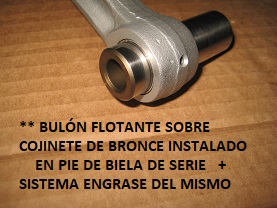 Montaje – fresado e instalación de cojinete anti fricción – lubricado, en el pie de biela para montaje de pistones de tipo flotante en lugar de montaje por interferencia del sistema original. Permite una mayor facilidad de respuesta de revoluciones así como el intercambio fácil de los pistones en las bielas. Válido para montaje de pistones tipo flotante racing con aro circlip de sujeción. – ** REALIZACIÓN EXPRESA PARA COMPETICIÓN – RECOMENDABLE LA RENOVACIÓN DE COJINETE DEL PIE DE BIELA CADA cierto número de kilómetros.