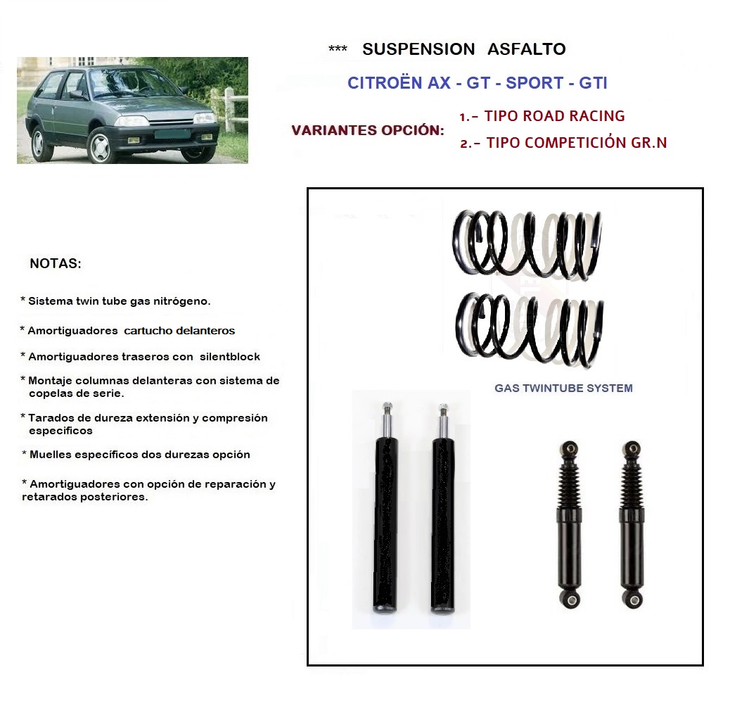** SET SUSPENSIÓN ESPECIAL: AMORTIGUADORES DELANTEROS Y TRASEROS – SPORT SS – RALLYE – COMPETICIÓN – (Tipo MONOBLOC – NO suspensión roscada) + MUELLES DELANTEROS. Configuración tipo sistema – GR.N – FIA