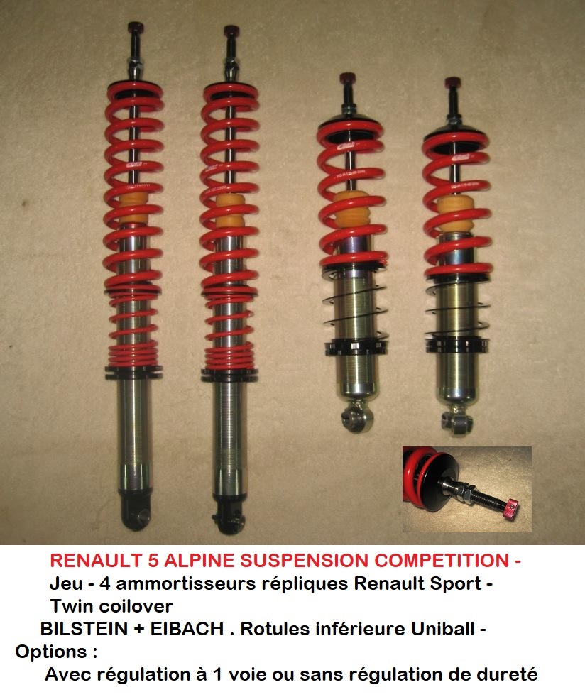 Modelo fabricación especifica según características de la época para Renault 5 Alpine Gr. 2. Fabricados con tarados y longitud concretas, se pueden fabricar en dos versiones (fijos de tarado o regulables manualmente por ruleta). La de tarado fijo será con tipo de dureza media y la otra con regulación de una vía en compresión y extensión, esta última para mejor ajuste y puesta a punto del vehículo.