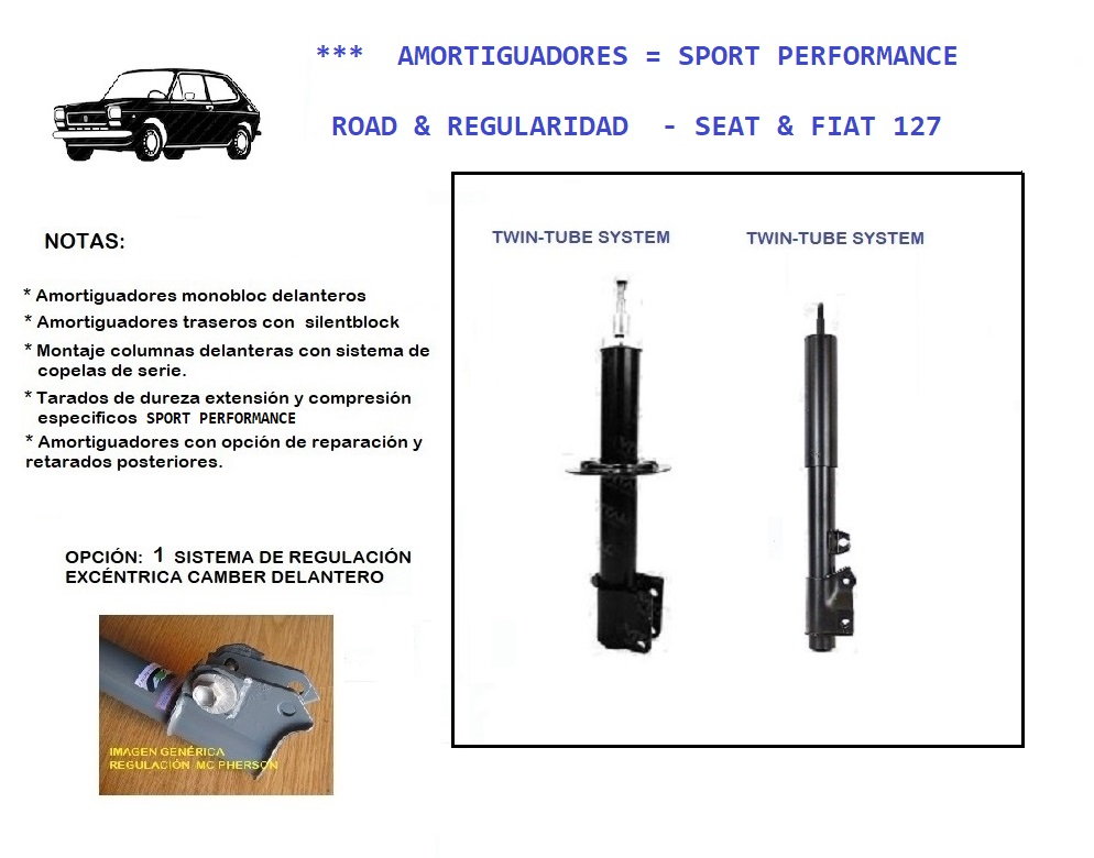 SET de 4 Amortiguadores (2 Delanteros + 2 Traseros ) – amortiguadores tipo bitubo SPORT PERFORMANCE, Tarados de dureza fijos aumentados 30 % s obre serie – Uso Road calle Sport o Rallyes Regularidad. – 1º calidad de fabricación en CEE.