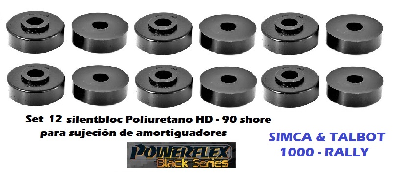Set de 12 silentbloc – para anclaje de los ejes – vástagos de amortiguador delanteros y traseros en su amarre superior e inferior – material POLIURETANO de DUREZA 90 shore – TOTAL precisión de funcionamiento y sin movimiento parásito de trabajo. – 1ª calidad de fabricación Reino Unido –